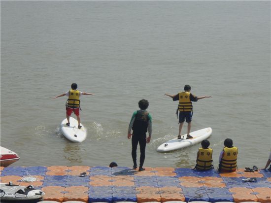 수상 트램블린, 한강래프팅, 바나나보트, 서핑보드 밸런스 등 4가지의 수상레포츠를 한 번에 체험할 수 있으며, 강습시간은 오후 1시부터 6시까지다.