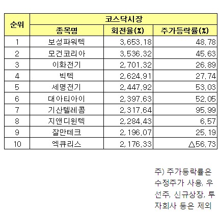 실제로 코스닥 시장에서 회전율이 높은 상위 종목들은 주가 상승률이 컸다는 공통점을 갖고 있다. 코스닥지수가 하락세를 보인 올 상반기 보성파워텍과 모건코리아는 48.78%, 45.63%의 주가등락률을 기록했고 이화전기(26.89%) 빅텍(27.74%) 세명전기(53.03%)도 두 자릿수의 상승률을 기록했다.