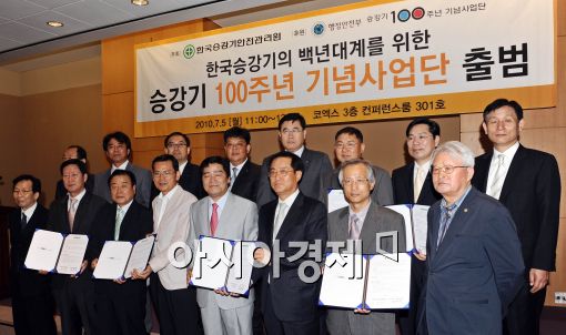 [아시아경제 이재문 기자]5일 오전 서울 삼성동 코엑스에서 열린 ‘승강기 100주년 기념사업단’ 출범식에서 김남덕 한국승강기안잔관리원장을 비롯한 기업과 단체 대표들이 협약식을 마친 뒤 기념촬영을 하고 있다.