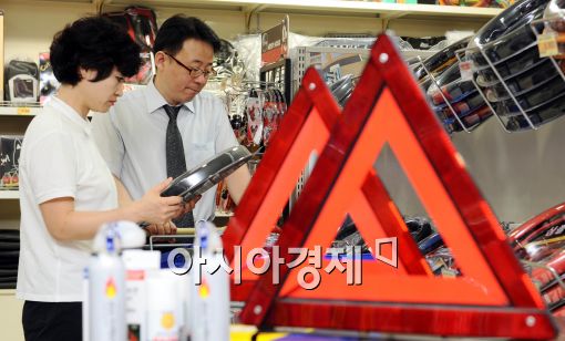 [아시아경제 이재문 기자]인천대교 버스추락 사고 발생 이후 삼각대 등 자동차 안전용품의 판매량이 급증하고 있는 가운데 6일 오후 롯데마트 서울역점을 찾은 시민들이 삼각대 등 자동차용품을 고르고 있다.