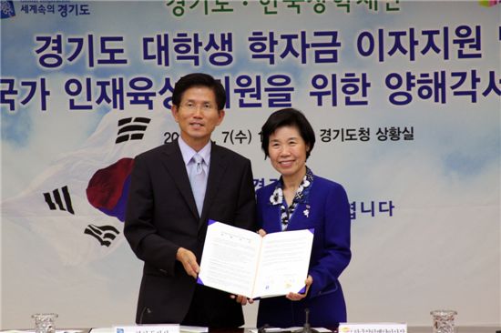 이번 협약으로 경기도는 올 하반기 중 7억원을 투입해 1만2000명의 대학생에게 1인당 연간 24~45만원의 학자금대출 이자를 지원한다. 이자지원 업무는 한국장학재단이 담당하게 된다.