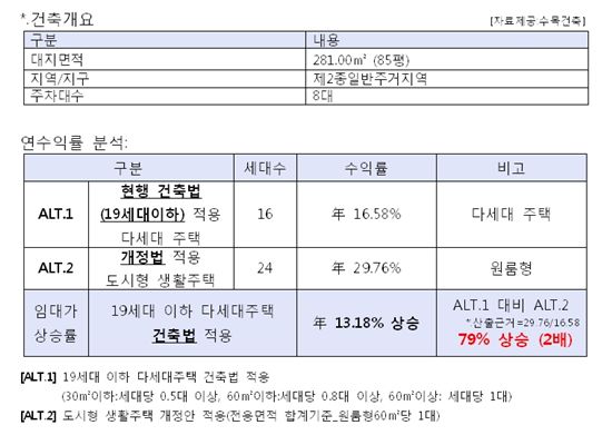 이것을 지상 5층 규모의 원룸형 도시형생활주택으로 지을 경우에는 완화된 주차장법 개정안에 따라 가구별 면적을 20㎡로 계획하면 다세대 주택보다 총 8가구가 증가한 24가구 개발이 가능하게 된다.