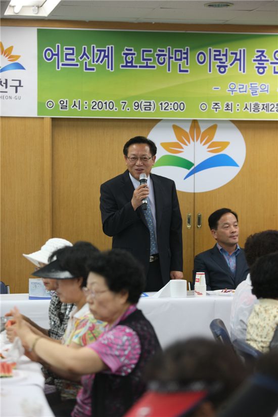 [아시아경제 박종일 기자]금천구(구청장 차성수) 시흥2동주민센터는 시흥2동 새마을부녀회 주최로 9일 오전 11시 30분부터 시흥2동주민센터 3층 문화관람실에서 어르신 150명을 초청, 지역주민 화합을 위한 삼계탕 나눔 행사를 개최했다. 사진은 차성수 금천구청장이 삼계탕을 먹고 있는 어르신들에게 인사하고 있는 모습.