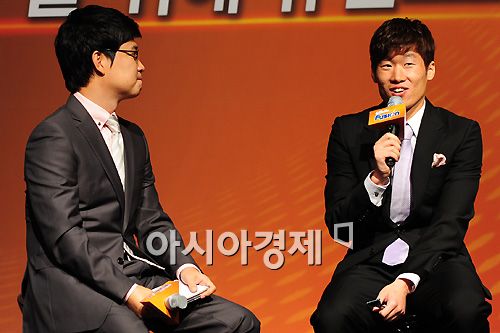 [아시아경제 한윤종 기자]박지성 선수(29, 맨체스터 유나이티드)가 11일 오전 서울 하얏트호텔에서 열린 질레트 퓨전 '최고의 직업' 포스터 촬영 현장공개 후 방송인 김성주와 인터뷰를 하고 있다.