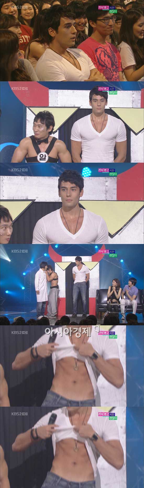 무대에 올라 온 줄리엔 강은 남다른 몸매 비율과 복근을 공개하며 이날 방청 온 관객들의 감탄을 유발했다. 특히 줄리엔 강 옆에 나란히 서있던 이승윤(알통28호)은 신장과 근육량 적나라하게 비교되는 굴욕을 맛봤다.