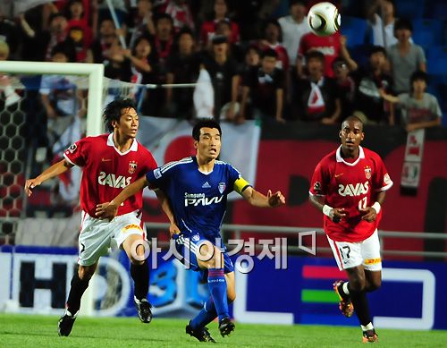 [수원월드컵경기장=아시아경제 한윤종 기자]11일 오후 경기도 수원월드컵경기장에서 열린 수원삼성 블루윙즈와 일본 우라와 레즈의 '한·일 월드컵 16강 동반 진출 기념'친선경기에서 수원삼성 조원희가 우라와 레이즈 수비수와 볼 다툼을 하고 있다.