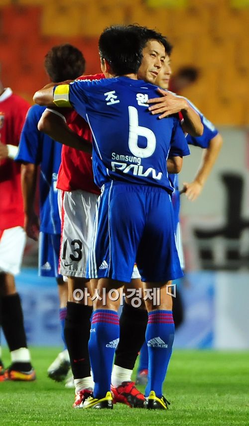 [수원월드컵경기장=아시아경제 한윤종 기자]11일 오후 경기도 수원월드컵경기장에서 열린 수원삼성 블루윙즈와 일본 우라와 레즈의 '한·일 월드컵 16강 동반 진출 기념'친선경기에서 수원삼성 조원희가 우라와 레이즈 선수와 경기가 끝나고 인사를 나누고 있다.