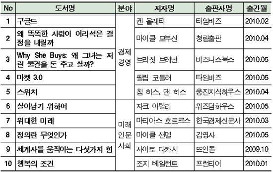 현대경제연구원은 경제경영분야에서 켄 올레타의 ‘구글드(googled)’, 마이클 모부신 ‘왜 똑똑한 사람이 어리석은 결정을 내릴까’, 필립 코틀러 ‘마켓3.0’등 5권의 책을 추천했다. 또 미래·인문·사회분야에서는 자클 아탈리의 ‘살아남기 위하여’ 마이클 샐덴의 ‘정의란 무엇인가’, 조지 베일런트 ‘행복의 조건’ 등 5권의 도서를 선정했다.
