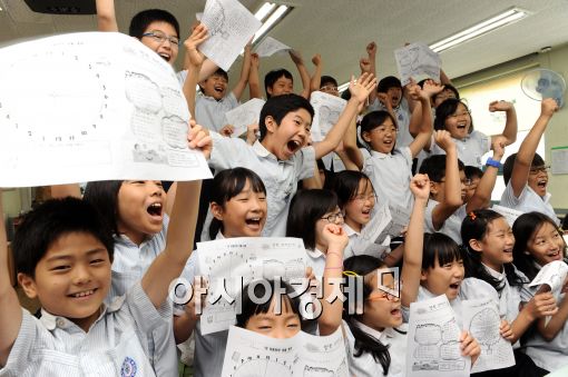 [아시아경제 이재문 기자]14일 오전 여름방학에 들어간 서울 청파동 신광초등학교에서 방학식을 마친 4학년 학생들이 활짝 웃으며 환호하고 있다.