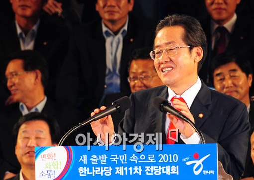 [아시아경제 윤동주 기자]14일 서울 잠실 실내체육관에서 열린 한나라당 전당대회에서 최고위원으로 선출된 당선된 홍준표 후보가 수락연설을 하고 있다.