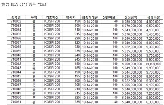 이번에 신규 상장하는 ELW는 코스피200지수를 기초자산으로 하는 콜 10개 종목과 풋 10개 종목으로 총 20개 종목이며, 10월 만기 지수형 ELW로 180에서 245사이의 다양한 행사가로 발행될 예정이다. 지난 5월 국내 주식워런트 시장에 진출한 도이치증권은 이번 상장으로 총 50개 종목의 ELW를 공급하게 된다.