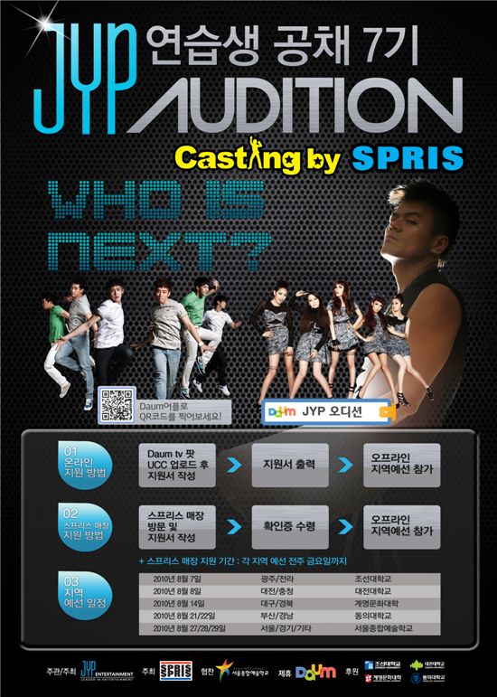 16일 JYP엔터테인먼트에 따르면 이번 오디션은 오는 8월 7일 광주-전라 지역(조선대학교)을 시작으로 8월 8일 대전-충청 지역(대전대학교), 8월 14일 대구-경북(계명문화대학), 8월 21일 부산-경남(동의대학교)를 거쳐 마지막으로 8월 27일부터 29일까지 서울-경기-기타 지역(서울종합예술학교)에서 열린다.