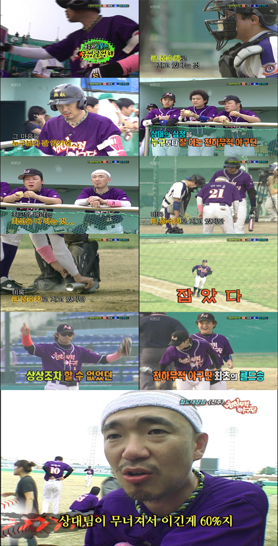 17일 방송된 KBS2 ‘천하무적 야구단’에서는 철도대장정 6차전 전주 헌터스팀과 2회말 까지 팽팽한 경기를 치룬 천하무적 야구단의 골프게임 승을 거둔 장면이 그려졌고, 이후 멤버들간에 훈훈함을 더하는 장면이 그려졌다.