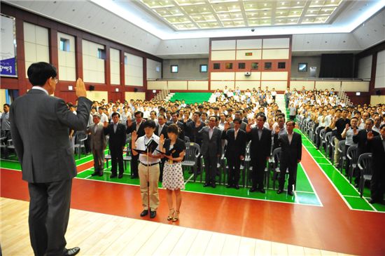 이날 직원 조례는 유덕열 구청장을 비롯 간부, 직원 등 700여명이 참석한 가운데 구청장과 전직원이 친절과 청렴을 할 것을 다짐하는 결의문을 낭독했다.