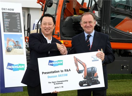 두산은 박용만 (주)두산 회장과 박지원 두산중공업 사장이 참석한 가운데 '디 오픈'에 굴삭기 기증식을 열었다고 19일 밝혔다. 두산은 "두산과 영국 왕실골프협회(R&A)의 상호협력 증진을 위해 굴삭기 기증을 추진했다"고 배경을 설명했다.