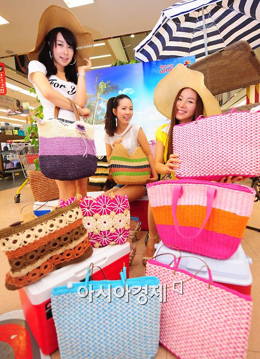 [아시아경제 윤동주 기자] 본격적인 여름휴가철을 맞아 21일 롯데마트는 합성 섬유가 아닌 종이, 옥수수, 수초등의 천연 식물로 만든 바캉스 핸드백 제품을 선보이고 있다.