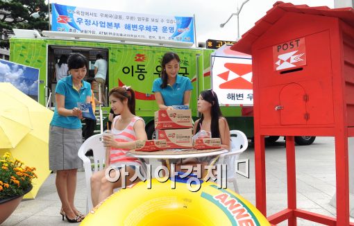 [아시아경제 이재문 기자]우정사업본부가 22일부터 열흘간 충남 보령 무창포해수욕장에서 우편업무와 금융업무를 한번에 해결할 수 있는 이동우체국을 운영한다. 21일 오전 서울 중앙우체국 앞에서 우체국 직원들과 도우미들이 이동우체국을 선보이고 있다.