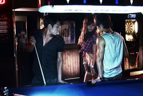 조권이 공개한 사진에는 컨트리한 느낌의 바(bar)를 배경으로, 섹시한 실루엣의 미녀가 당구대에 기대어 있는 창민, 이현과 함께 어울려 있는 장면이 담겨 있다.