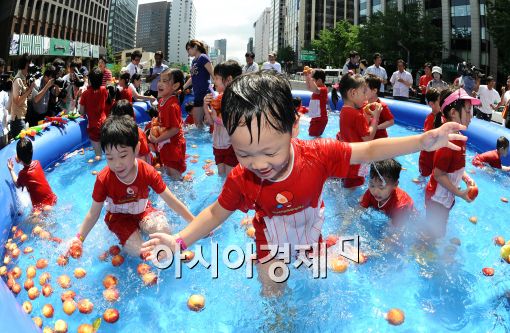 [아시아경제 이재문 기자]22일 서울 청계광장에서 농협-한국복숭아생산자협의회 주최로 열린 '제8회 2010 복숭아데이' 행사를 찾은 유치원 어린이들이 간이 수영장에서 복숭아를 건지며 즐거운 시간을 보내고 있다.