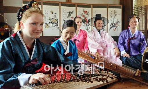 [아시아경제 이재문 기자]22일 오후 서울 남산 한옥마을에서 성균관대 SKK GSB 여름학교에 참가한 독일 슈타인바이스 대학 학생들이 한복을 곱게 차려입고 우리 굿거리 장단을 배우며 즐거운 시간을 보내고 있다.