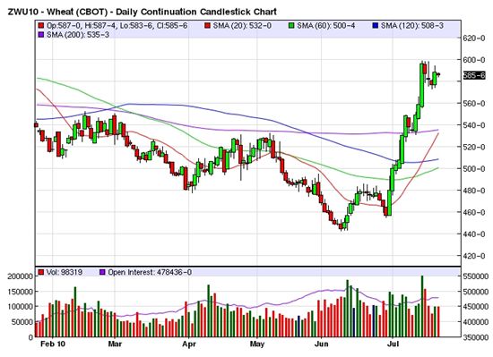 전 세계 밀거래 기준가격이 되는 시카고 상품거래소(CBOT)의 밀 가격은 7월 이후 급등한 상태다. 21일(현지시간) CBOT 9월만기 밀 가격은 전일대비 부쉘당 11.25센트(1.95%) 상승한 5.8825달러로 거래를 마쳤다.