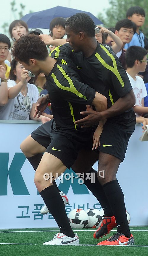 [수원(경기)=아시아경제 한윤종 기자]프리미어리거 에브라(29, 맨유)가 24일 오전 경기도 수원시 영통구 망포동 박지성 유소년축구센터(JSFC)에서 열린 '박지성 축구클리닉'에서 박지성(29, 맨유)가 치열한 몸싸움을 하고 있다.