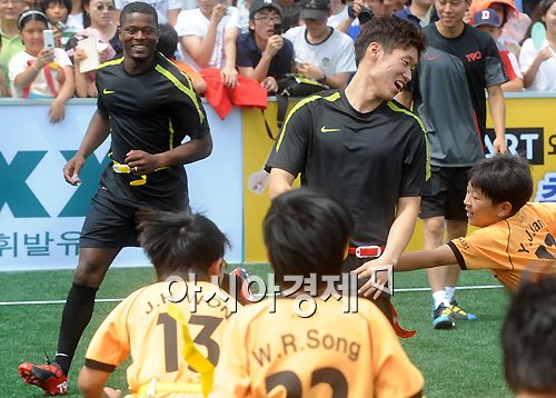 [수원(경기)=아시아경제 한윤종 기자]프리미어리거 박지성과 에브라가 24일 오전 경기도 수원시 영통구 망포동 박지성 유소년축구센터(JSFC)에서 열린 '박지성 축구클리닉'에서 유소년 선수들과 몸풀기 게임을 하고 있다.