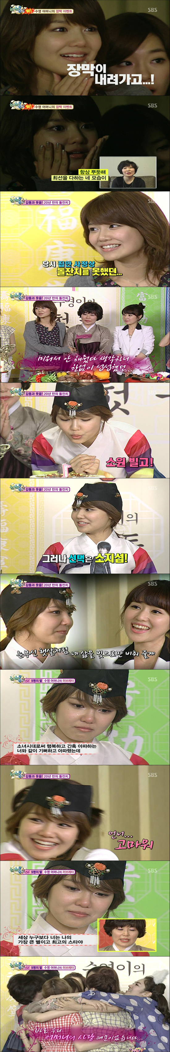 또한 수영의 돌잔치를 위해 뮤지컬 배우인 친언니 최수진씨가 멋진 노래를 불러주며 수영을 꼭 안아줬다. 끝으로 어머니 문씨는 딸 수영을 비롯해 8명의 소녀시대 딸들에게 진심어린 편지를 직접 읽어주며 감동을 자아냈다. 수영을 비롯해 소녀시대 멤버들은 눈물을 흘리며 서로를 꼭 끌어안으며 훈훈한 모습을 연출했다.