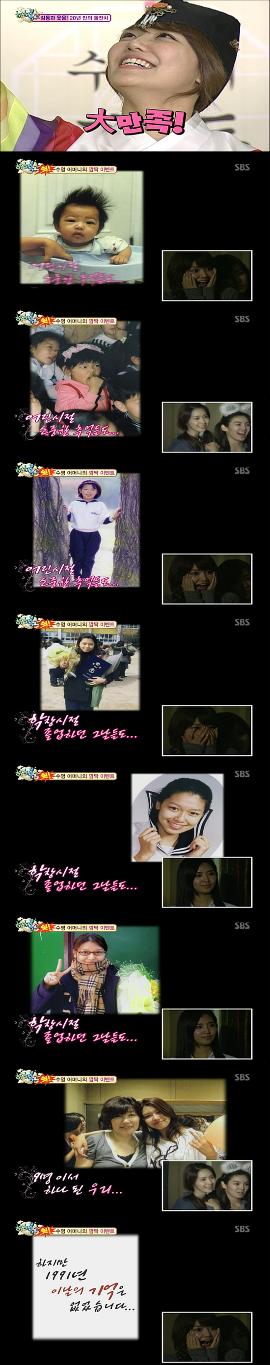 끝으로 어머니 문씨는 딸 수영을 비롯해 8명의 소녀시대 딸들에게 진심어린 편지를 직접 읽어주며 감동을 자아냈다. 수영을 비롯해 소녀시대 멤버들은 눈물을 흘리며 서로를 꼭 끌어안으며 훈훈한 모습을 연출했다.