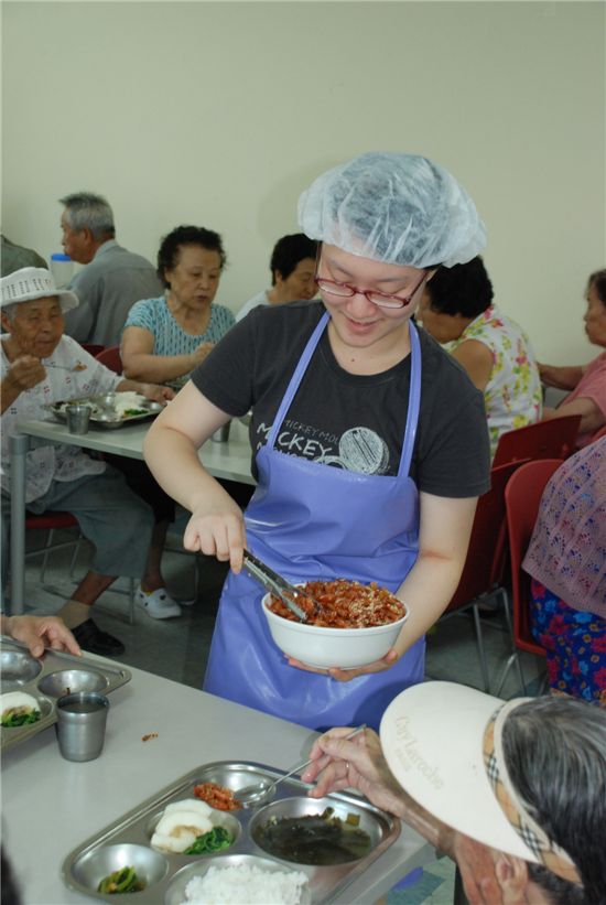 송파구 마천종합사회복지관 내 경로식당을 찾은 노인들은 낯선 젊은이들로부터 음식을 받아들었다. 앞치마에 위생모까지 갖춘 젊은이들은 다름 아닌 송파구 여름방학 대학생 행정도우미들.