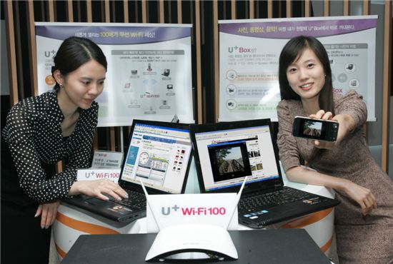 기존의 AP보다 속도품질과 커버리지, 보안, 관리 등이 대폭 강화된 802.11n 방식의 초고속 무선랜 ‘U+ Wi-Fi100’ 서비스는 지난 16일 처음 출시된 이래 하루 2200~4200여대의 신청이 들어와 26일 오전 9시 30분 집계 결과 3만대를 넘어섰다.