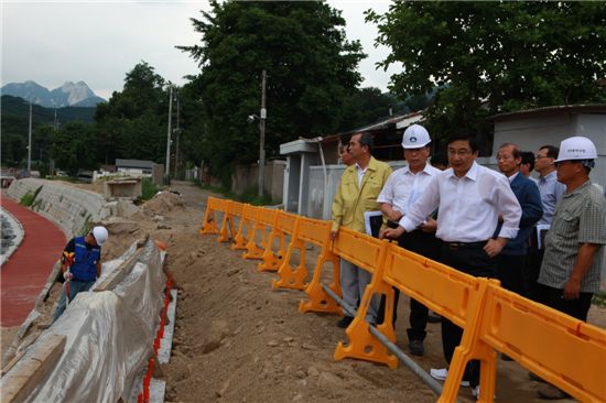 $pos="C";$title="";$txt="이동진구청장(좌부터 세 번째) 도봉천 생태하천 공사현장을 방문하여 주민에게 불편사항이 있는지 살피고 있다.