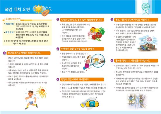 구에서는 폭염 대처 요령으로 ▲한낮의 뜨거운 햇볕은 피하세요 ▲식사는 균형있게 물은 많이 섭취하세요 ▲위생적인 생활습관을 가지세요 ▲만일의 정전사태에 대비하세요 ▲동료, 이웃의 건강에 관심을 가져주세요 ▲올바른 냉방기기 사용법을 숙지해 주세요 ▲편안한 잠자리를 가지세요 등 7가지를 제시한다.