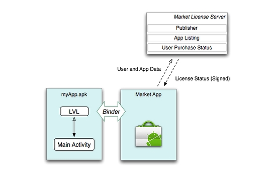 구글이 제공하는 라이브러리(library)를 추가하면 라이선싱 서버에 확인을 요청해 사용자의 라이선스 상태를 검토하게 된다. 서버는 기존 저장된 매출 기록에 근거해 사용 허가를 받은 사용자인지를 확인하게 된다.