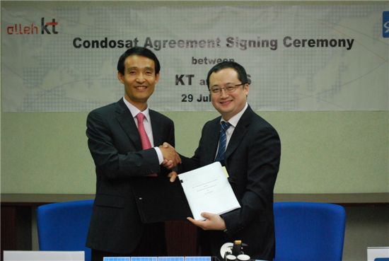[아시아경제 조성훈 기자]KT(대표 이석채)는 29일 홍콩 소재 위성사업자인 아시아 브로드캐스트 새틀라이트(Asia Broadcast Satellite, ABS)사와 콘도샛(Condosat, 공동위성)에 대한 협약을 체결하였다고 밝혔다.