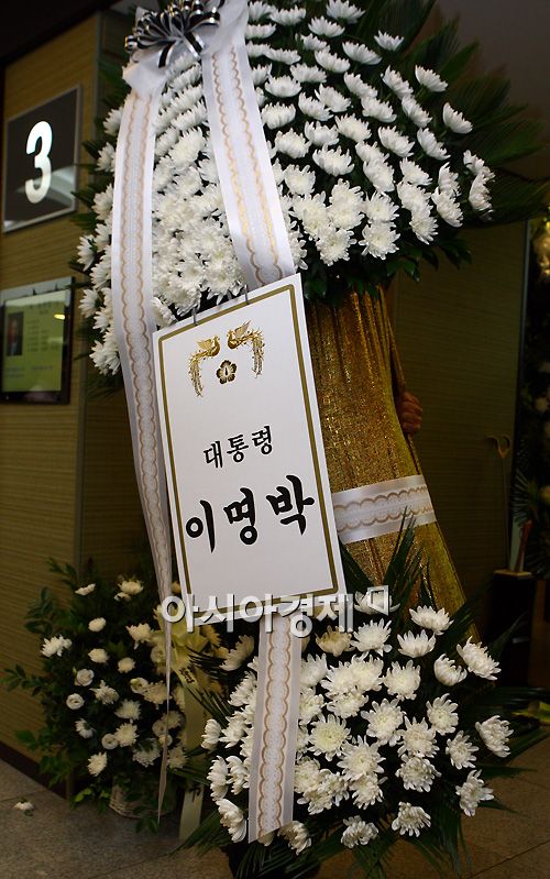 [아시아경제 한윤종 기자]29일 오전 서울 일원동 삼성 서울병원 장례식장에 마련된 원로 코미디언 故 백남봉(본명 박두식)의 빈소에 이명박 대통령의 화환이 도착하고 있다.