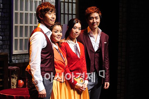 [아시아경제 이기범 기자]배우 김경수(왼쪽부터), 유나영, 우금지, 김태한이 3일 오후 서울 동숭동 아트원씨어터에서 진행된 뮤지컬 '카페인' 제작발표회에서 포토타임을 갖고 있다.