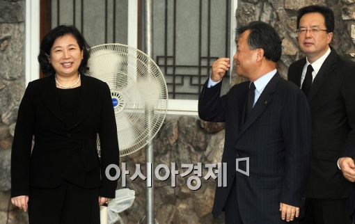 [아시아경제 이재문 기자]현정은 현대그룹 회장이 고(故) 정몽헌 회장의 추모 7주기를 맞아 4일 오전 경기도 하남시 창우리 선영에서 김중겸 현대건설 사장과 대화를 나누고 있다.