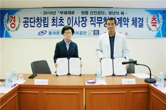 [아시아경제 박종일 기자]동대문구시설관리공단(이사장 김경술)은 4일 임원을 비롯한 전 간부가 참석한 가운데 김경술 이사장과 현종윤 이사회 의장과의 ‘CEO 직무청렴계약’ 을 체결했다고 밝혔다.