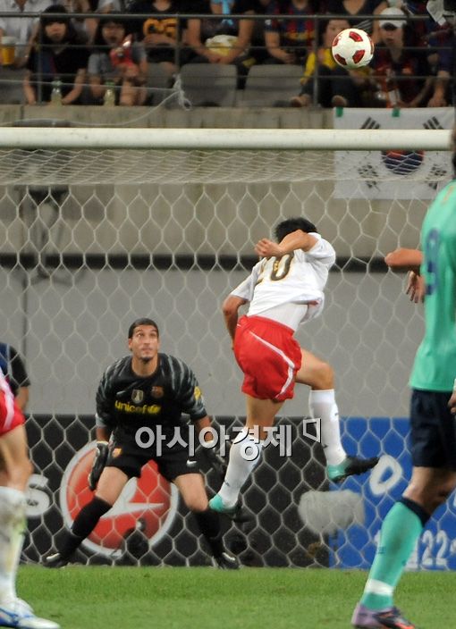 [상암=아시아경제 한윤종 기자]4일 오후 상암동 월드컵경기장에서 열린 'FC바르셀로나 초청 K리그 올스타전'에서 K리그 올스타 이동국 선수가 역전 헤딩슛을 넣고 있다.