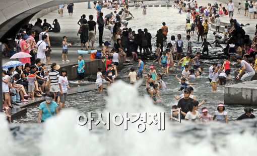 [아시아경제 이재문 기자]연일 무더위가 계속되고 있는 가운데 5일 오후 서울 청계천을 찾은 아이들이 물속에 들어가 더위를 식히고 있다.