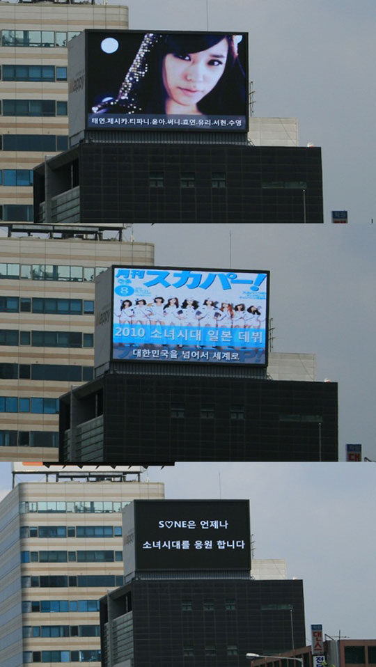 전광판 광고는 소녀시대 2집 리패키지 음반 타이틀곡 ‘런 데빌 런’(Run Devil Run)의 이미지를 이용 “차세대 한류의 중심 소녀시대. 국민 걸 그룹 소녀시대 데뷔 3주년. 대한민국을 넘어 세계로 진출하는 소녀시대 데뷔 3주년을 축하합니다. S♡NE은 언제나 소녀시대를 응원합니다”는 3주년 축하메시지와 그녀들의 일본진출을 응원하는 자막이 들어갔다.