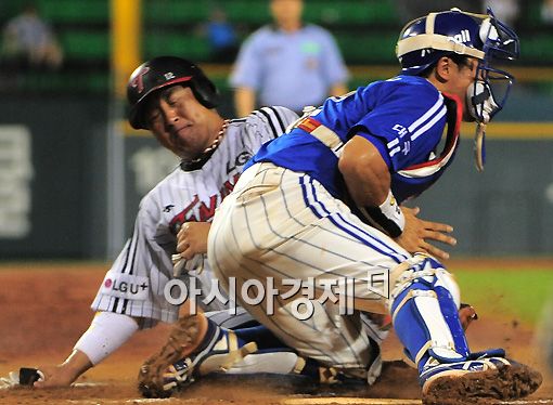 6회말 2사 1, 2루 LG 오지환의 1타점 적시타에 2루주자 조인성이 홈에 슬라이딩을 하고 있다.