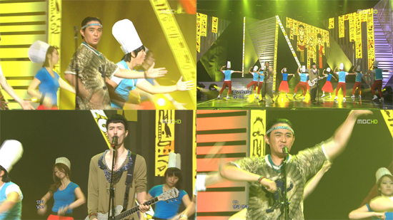노라조는 7일 오후 4시 10분부터 생방송으로 진행된 MBC '쇼!음악중심'에 출연해 4집 정규음반 ‘환골탈태’의 타이틀곡 ‘카레’를 열창했다.