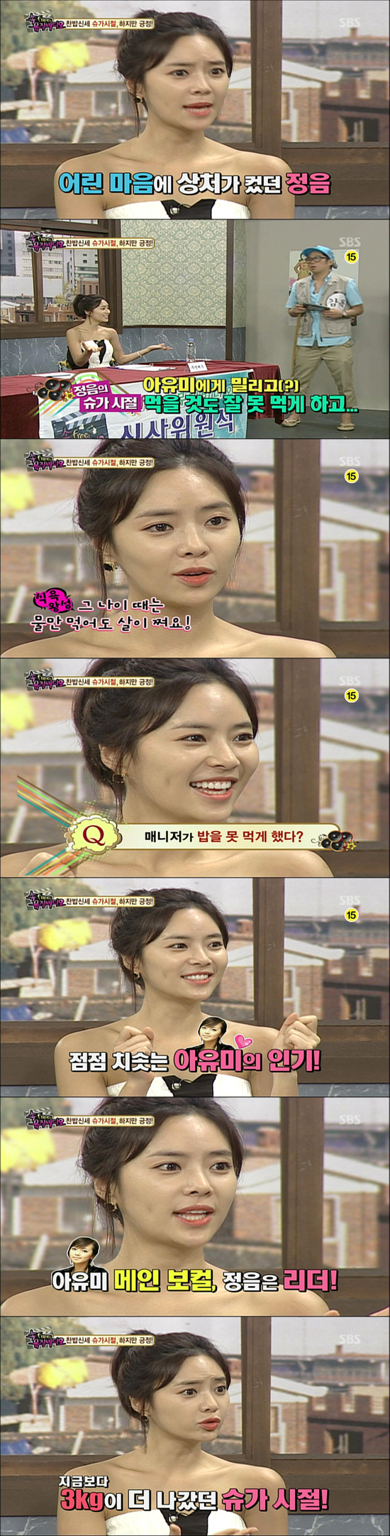 황정은은 “슈가시절 살이 많이 쪄서 매니저가 밥을 먹지 못하게 해서 힘들었다”며 “당시 몸무게는 56kg으로 지금 보다 3kg 더 나갔었다”고 밝혔다. 그녀는 “당시에는 물만 마셔도 살찌는 성장기였다”고 덧붙였다.