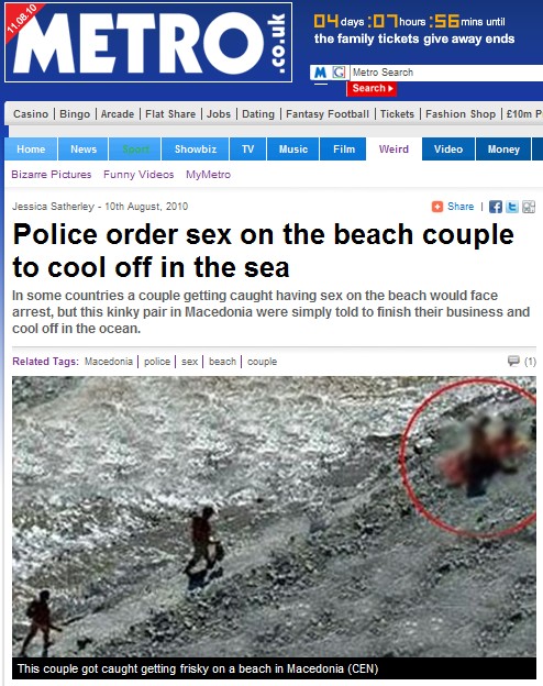 영국 일간 메트로는 최근 사람들로 북적대는 마케도니아의 한 해변에서, 그것도 대낮에 청춘 남녀가 알몸으로 서로 부둥켜 안고 열정을 불사르는 낯 뜨거운 장면이 연출됐다고 10일(현지시간) 전했다.