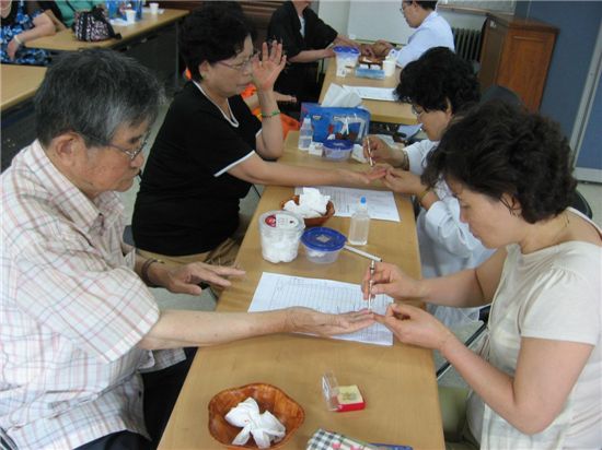 은평구(구청장 김우영) 자원봉사센터 ‘지역 어르신 건강지킴이 봉사단’은 지역내 사회복지시설을 순회하며 수지침 봉사활동을 펼치고 있다.