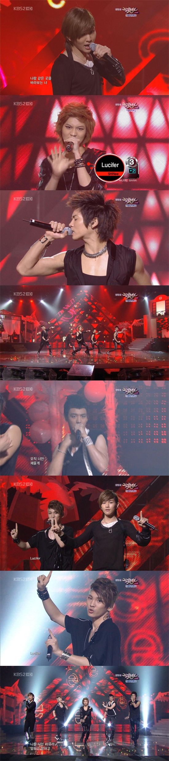 샤이니는 13일 오후 5시 50분부터 생방송으로 KBS2 '뮤직뱅크'에 출연해 두 번째 정규음반 ‘루시퍼’(Lucifer)의 타이틀곡 ‘루시퍼’를 공개했다.