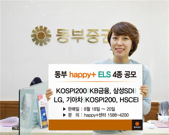 동부증권(대표 고원종)은 18일부터 20일까지 원금보장형 ‘동부 happy+ 파생결합증권(ELS) 제348회’와 스텝다운형 ‘동부 happy+ 파생결합증권(ELS) 제349회, 제350회, 제351회’ 등 ELS 4종을 판매한다.