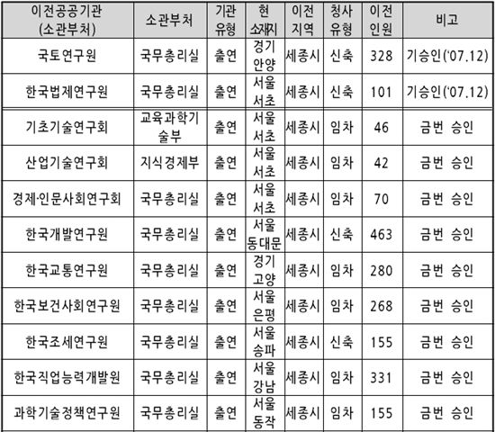 이번에 세종시 이전 승인을 받은 공공기관은 KDI, 조세연구원, 한국교통연구원, 기초기술연구회, 산업기술연구회, 경제·인문사회연구회, 한국직업능력개발원, 과학기술정책연구원, 산업연구원 등 15개다.